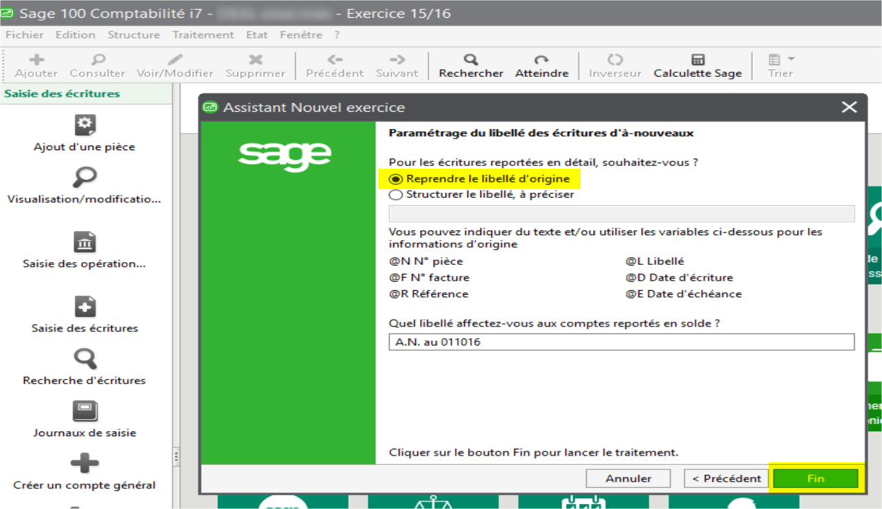 Paramétrage du libellé des écritures d'à-nouveaux : Cocher Reprendre le libellé d’origine puis cliquer sur Fin.