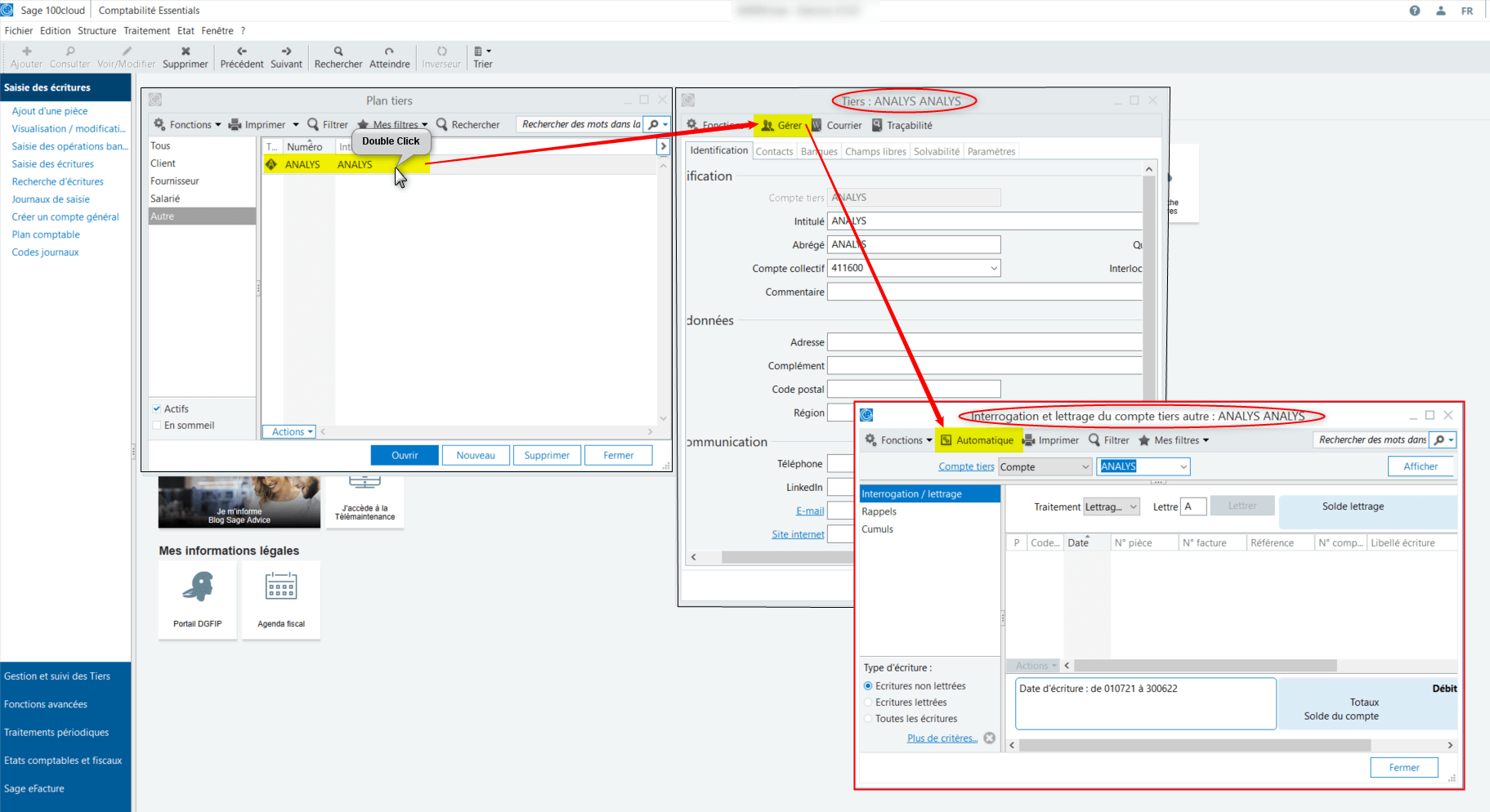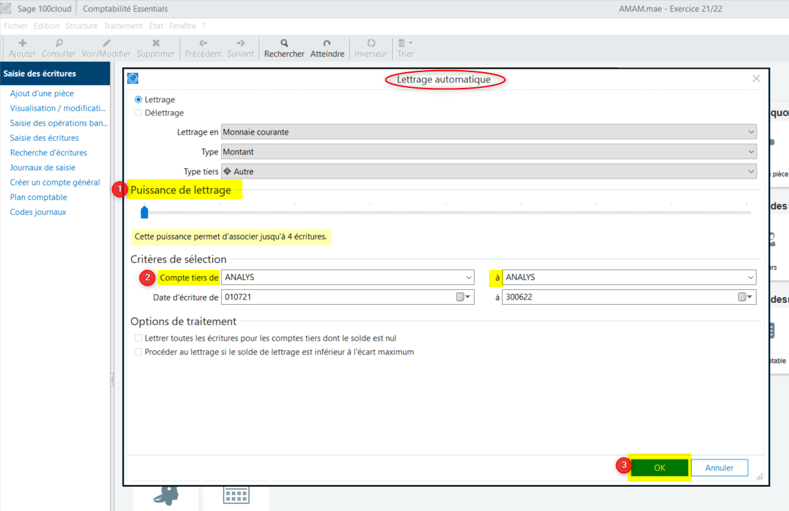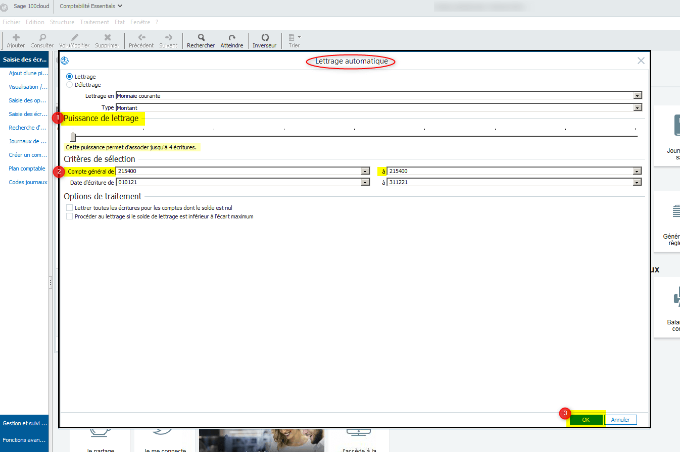 Procédure pour lettrer automatiquement un compte dans SAGE 100C.