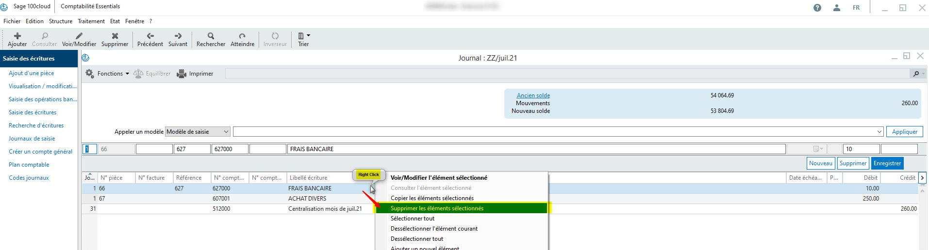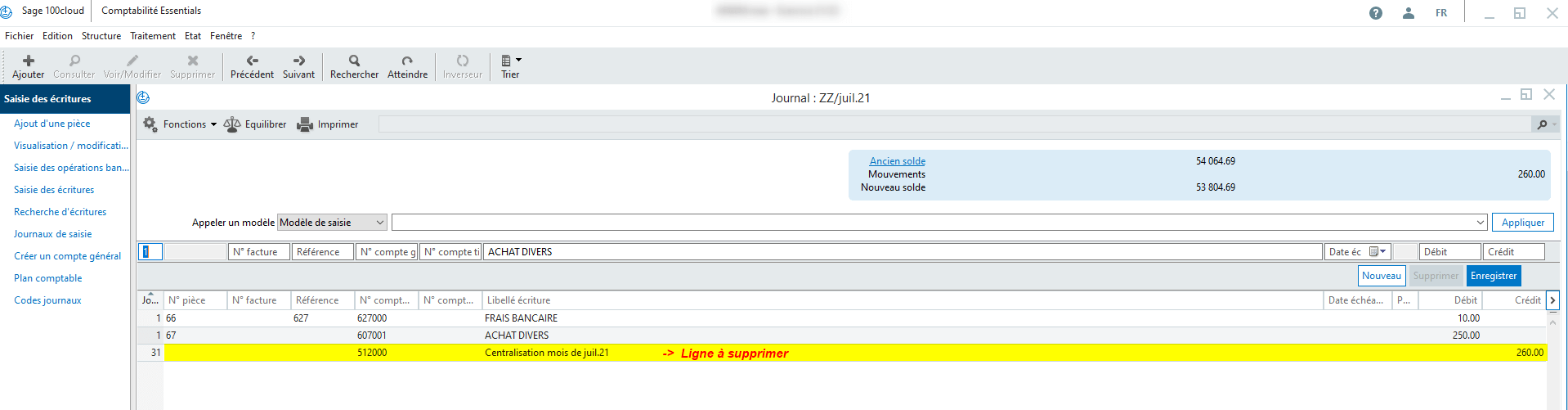 Pour supprimer la ligne de centralisation, il est nécessaire de supprimer toutes les lignes détails du journal concerné.