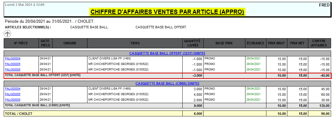 Il est possible de connaitre le nombre d'articles offerts sur une période de façon à se faire rembourser ces articles par le fournisseur dans le cadre d'offres promotionnelles de sa part. Pour cela il suffit de sortir l'édition suivante :
