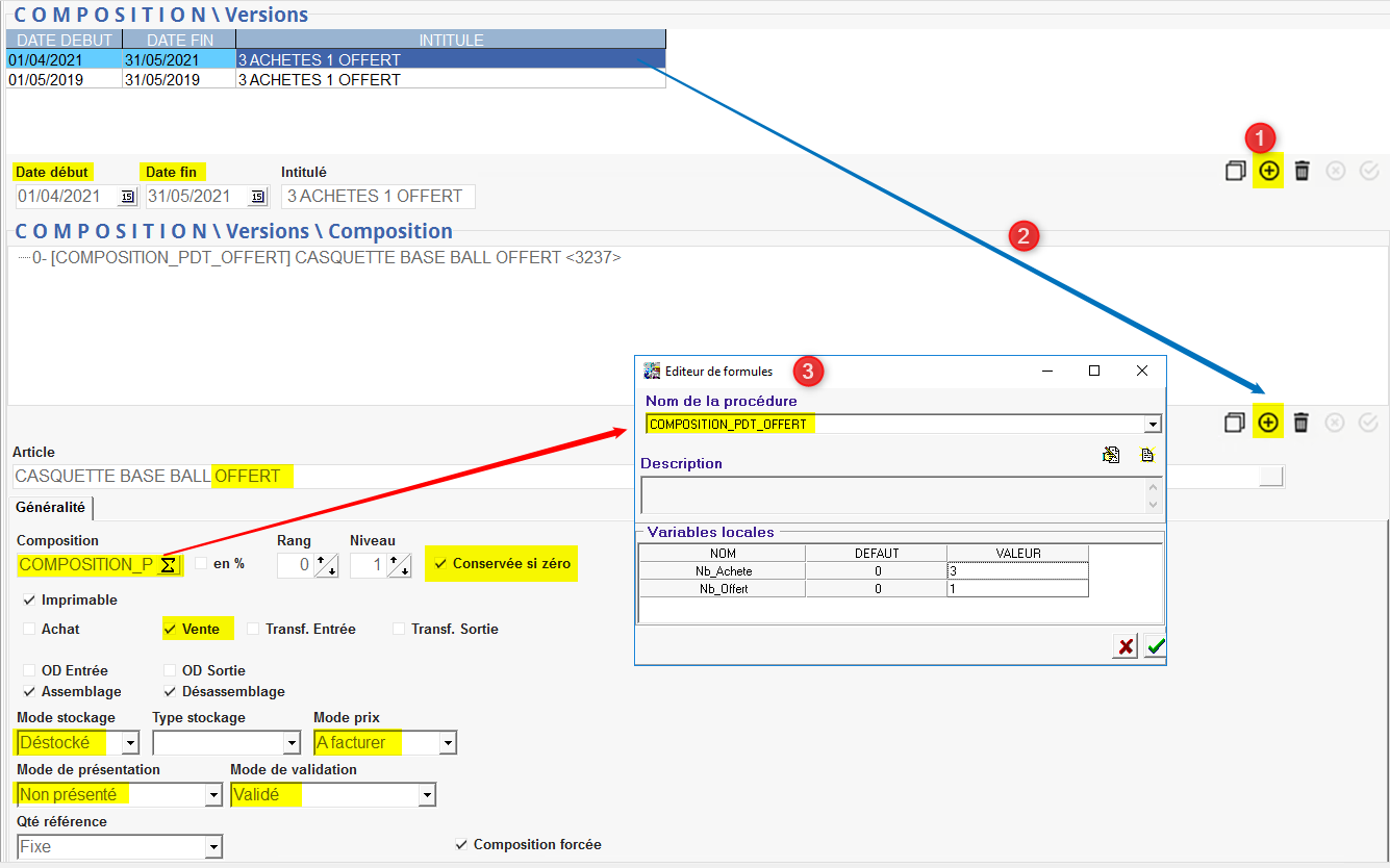 Puis, dans l'article d'origine, il conviendra de créer une composition utilisant cet article offert.
