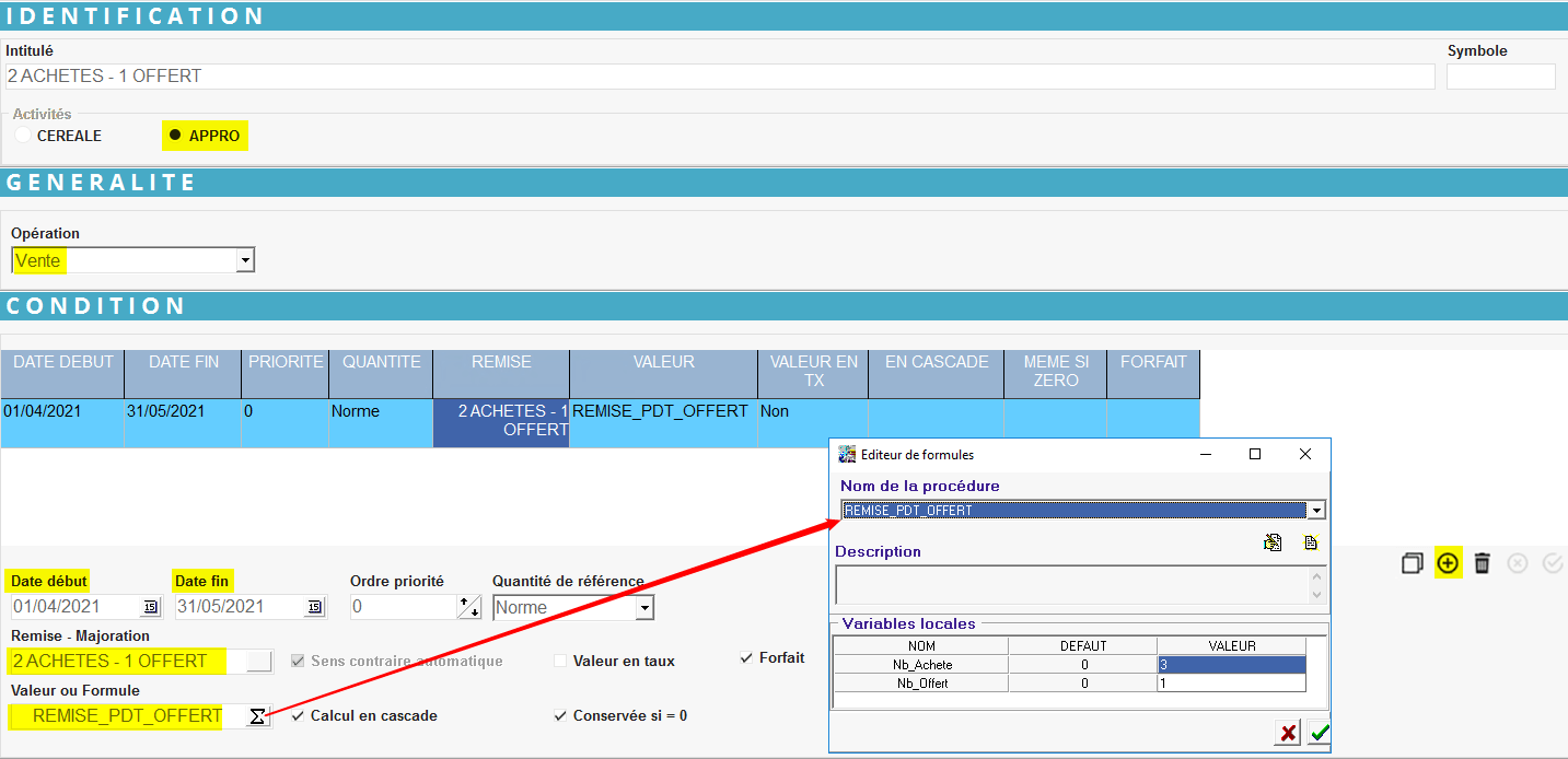 - Plus simple et rapide à mettre en place, il suffit de créer la remise et la condition tarifaire qui pourra s'appliquer à une série d'articles.