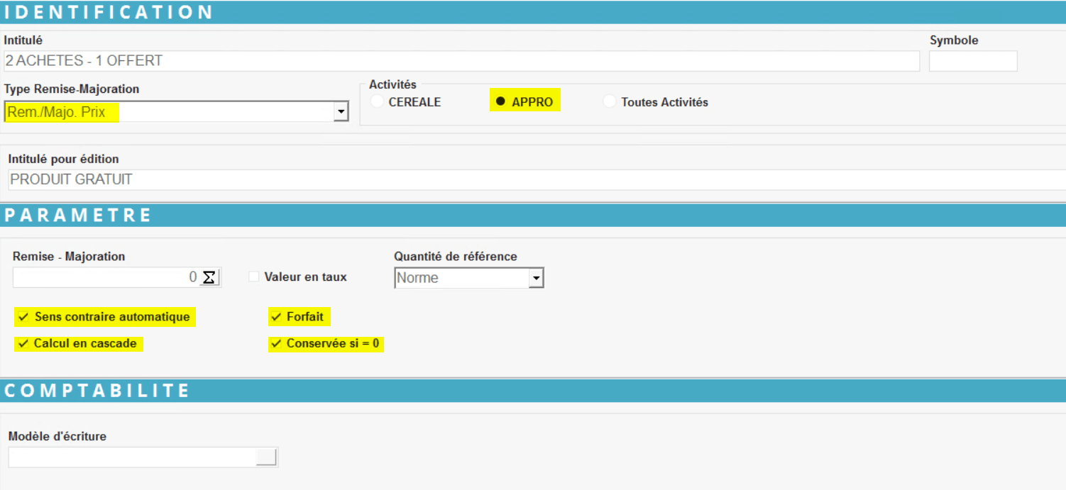 Renseigner la remise avec les champs surlignés ci-desssous :