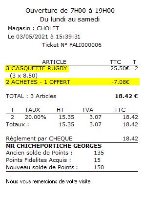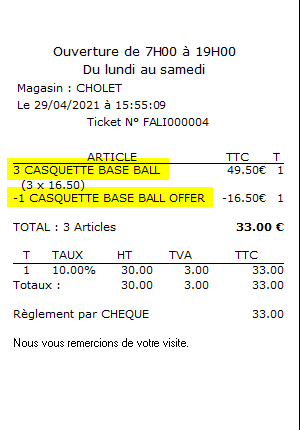 Dans une facture, dès que le nombre d'article acheté est un multiple du nombre global d'articles renseigné, alors les articles offerts montent et se présentent de la façon suivante dans un ticket LISA par exemple :