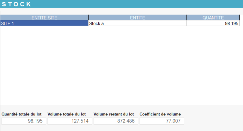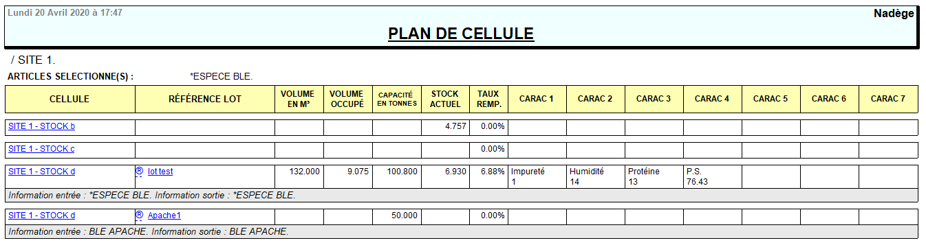 Description du contenu des cellules :Volumes, capacité, stock actuel, caractéristiques du lot présent.