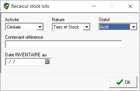 Si une anomalie est observée entre le stock réel et le calcul des stocks, il est possible de lancer un traitement de recalcul des stocks Lots :
