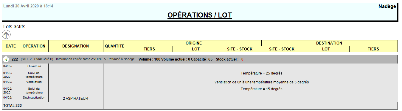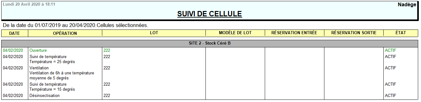 Enregistrement et conservation de l’ensemble des informations d’entrées, de sorties et d’interventions divers (Nettoyage, ouverture lot, ventilation, traitement, etc) dans une cellule de stockage de l'ouverture à la fermeture du lot (tranche de vie de la cellule).