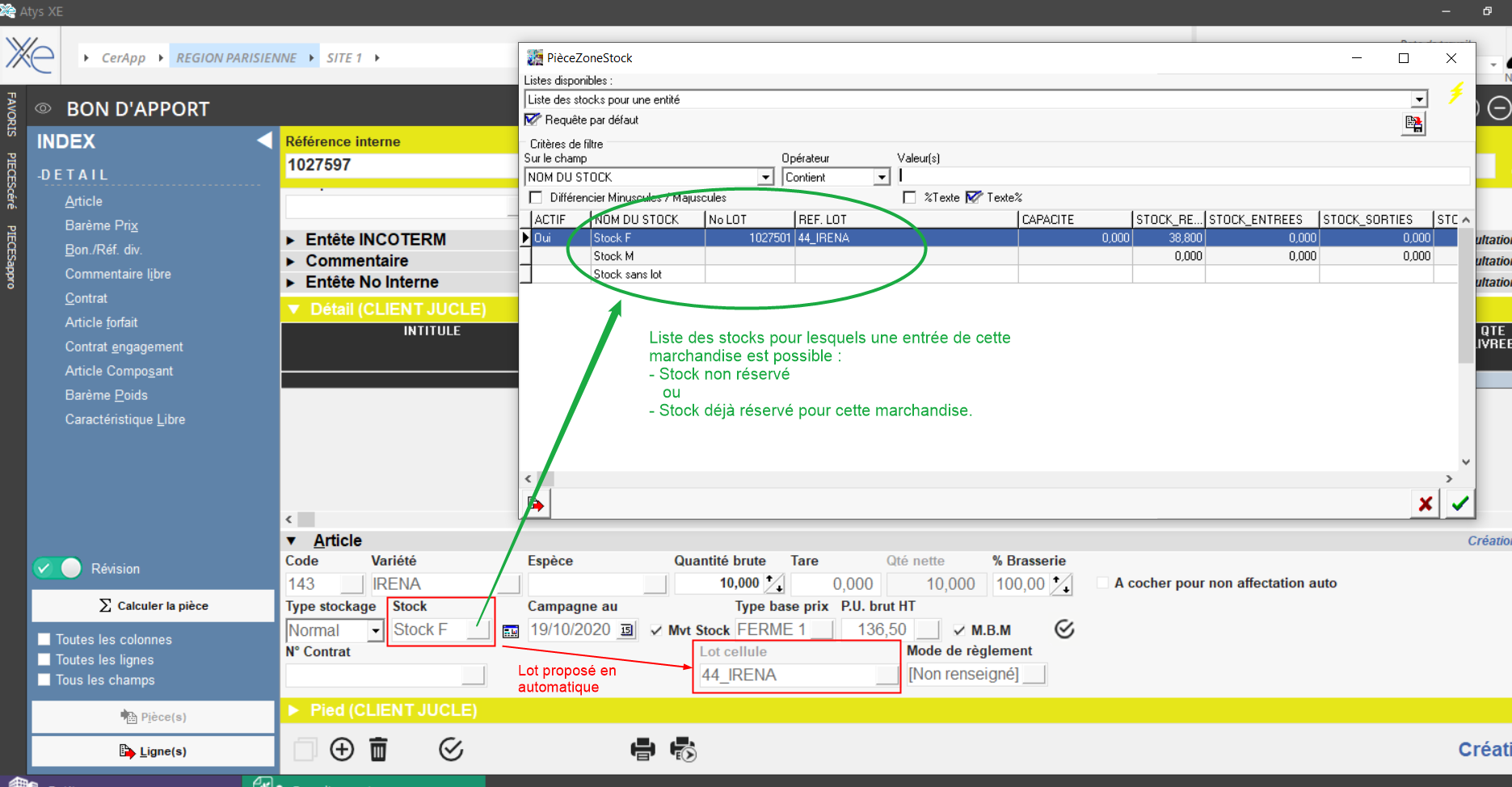 Dans le cas de l'entrée de marchandises tracées, ATYS propose automatiquement un stock (cellule) sur lequel un lot est réservé pour cette marchandise, s'il y en a un.