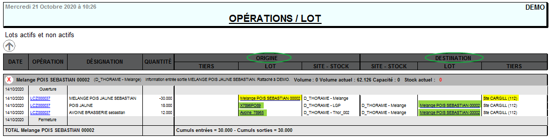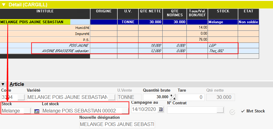 Lors d'une livraison Vente Céréale, les lots des composants sont déstockés et un lot mélange (lot destination des composant et lot origine du composé) est créé et refermé dans la foulée pour la gestion de la traçabilité :