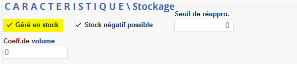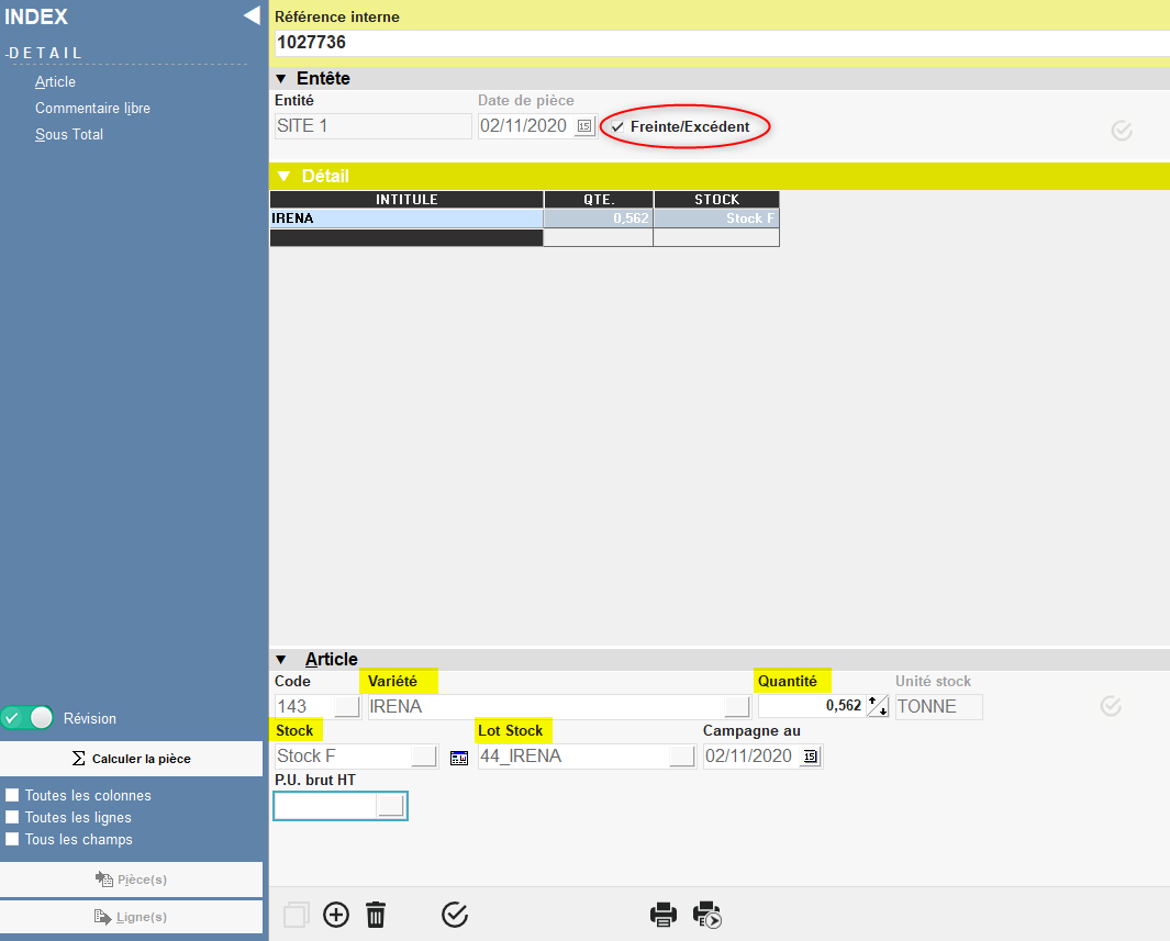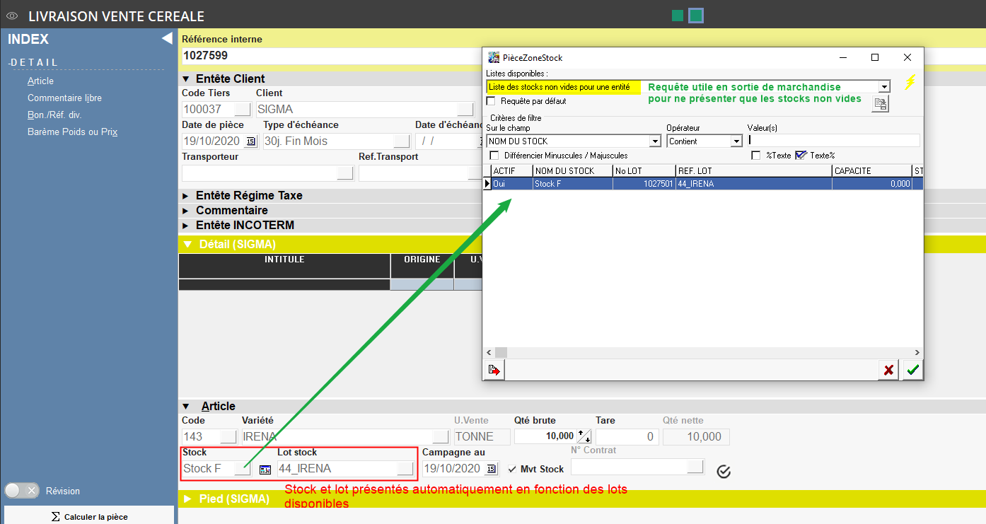 - L'article et le Stock sont automatiquement complétés en fonction des données de la pièce dans laquelle on travaille.