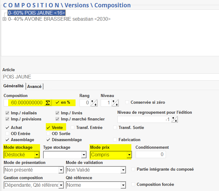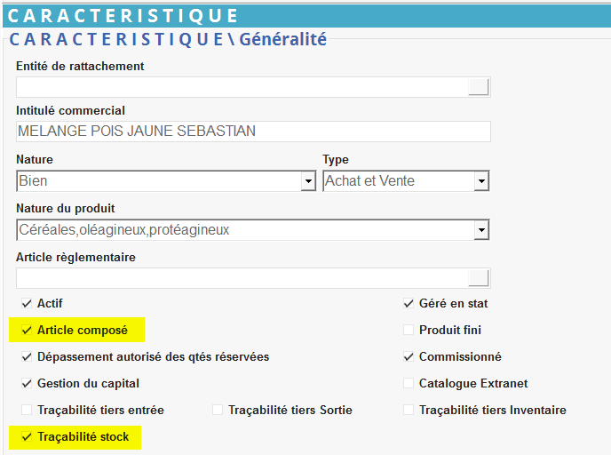 Par exemple : les entrées sont saisies sur des variétés meunières (apache, camp rémy, soisson etc) et les sorties sont réservées sur un article blé meunier seulement, ces articles pouvant être reliés à travers une espèce…