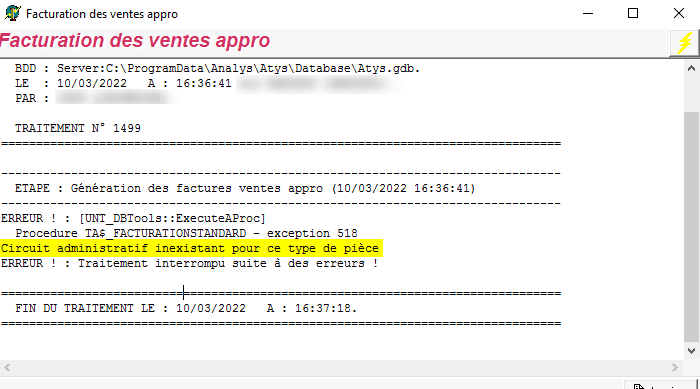 Si un message d’erreur comportant la phrase « Circuit administratif inexistant pour ce type de pièce » apparait, alors cela signifie que vous n’êtes pas positionnée sur l’entité prévue pour la saisie ou génération de pièces de facture vente appro.