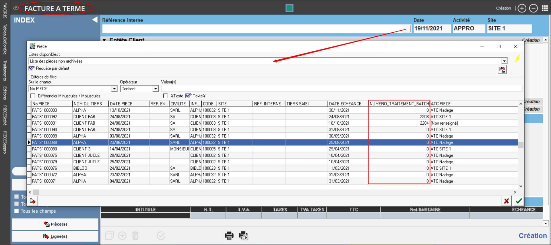 Facture à terme - Numéro de traitement
