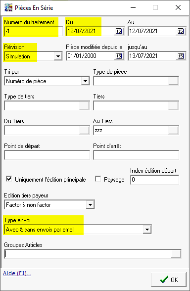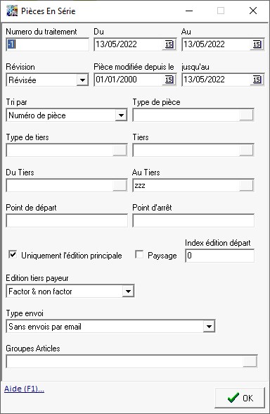 - Soit par l'édition des pièces en série en renseignant en particulier les champs surlignés ci-dessous :