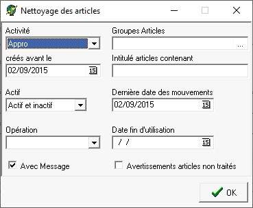 Le traitement de nettoyage d'articles permet différentes actions sur la base de données Articles :- Affecter une date de fin de commercialisation à des articles.