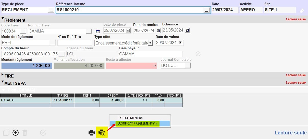 Il est ensuite possible, si nécessaire, d'éditer un justificatif de règlement à remettre au client, récapitulant les informations relatives au règlement généré.