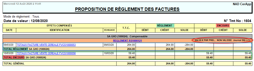 Traitements -> Règlement automatique -> Validation Règlement Renseigner le numéro de traitement de règlement automatique