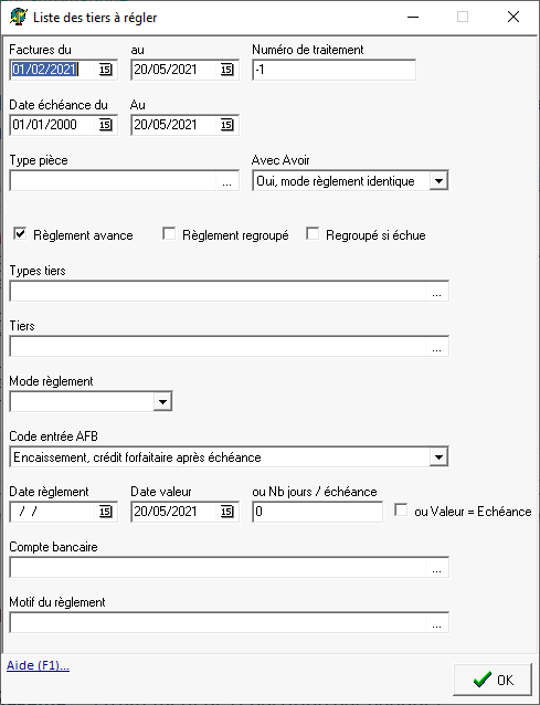 Paramètre visible uniquement si Règlement regroupé est décoché- Si coché: Une pièce de règlement unique est générée, par tiers, pour toutes les pièces de facture échues à la date du règlement et un règlement par facture non échue.