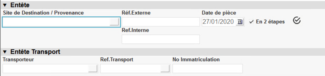 1. Compléter l'entête de pièce : Sélectionner le site de provenance du transfert cette fois-ci.