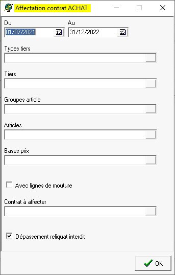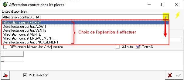Les fenêtres de sélection sont très similaires. Nous prendrons, ici, l'exemple de l'affectation de contrat d'achat.