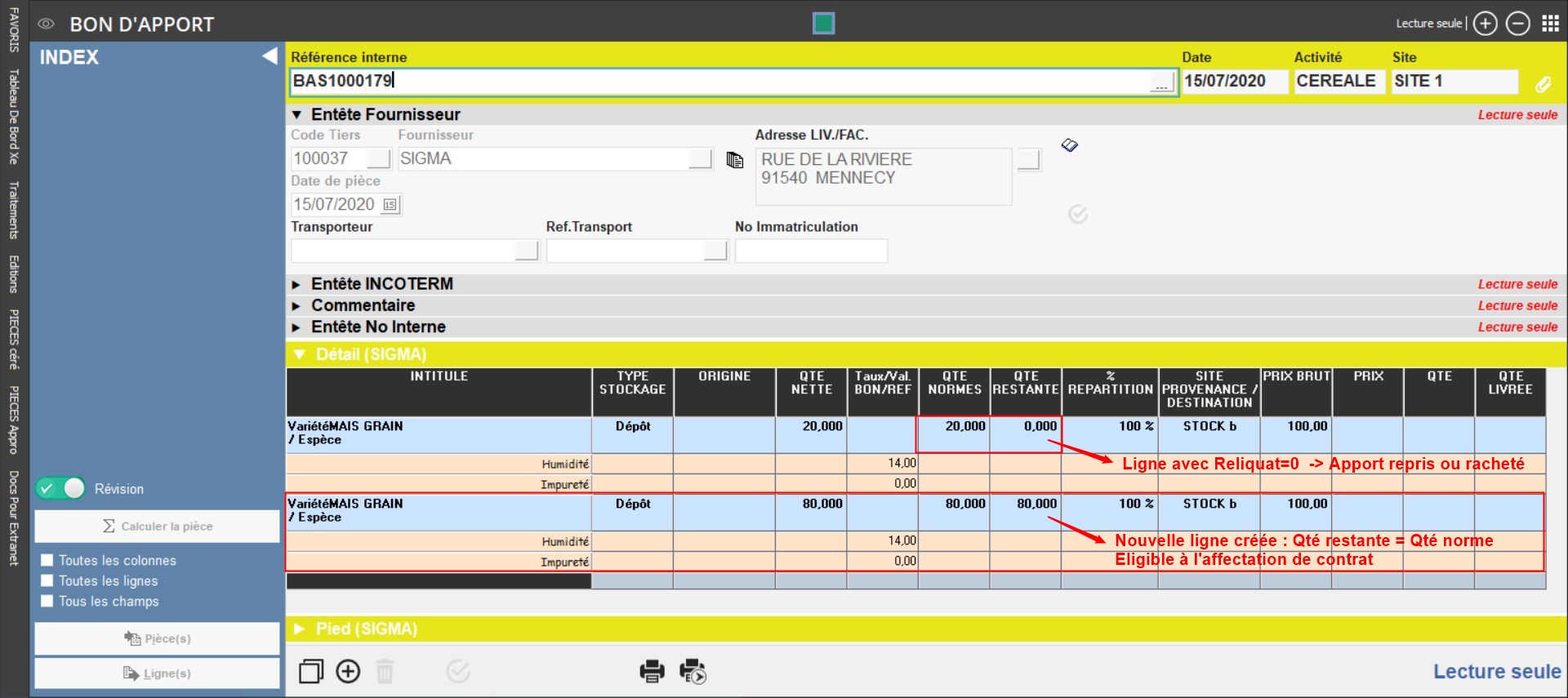 Lorsque l'on effectue une reprise ou un rachat partiel d'un bon d'apport, la ligne de dépôt devient non modifiable et on ne peut plus affecter un contrat pour le reliquat de la marchandise.Le traitement analyse les lignes de réception en dépôt, pour lesquelles il reste du reliquat. Il fractionne alors la ligne d’apport en :