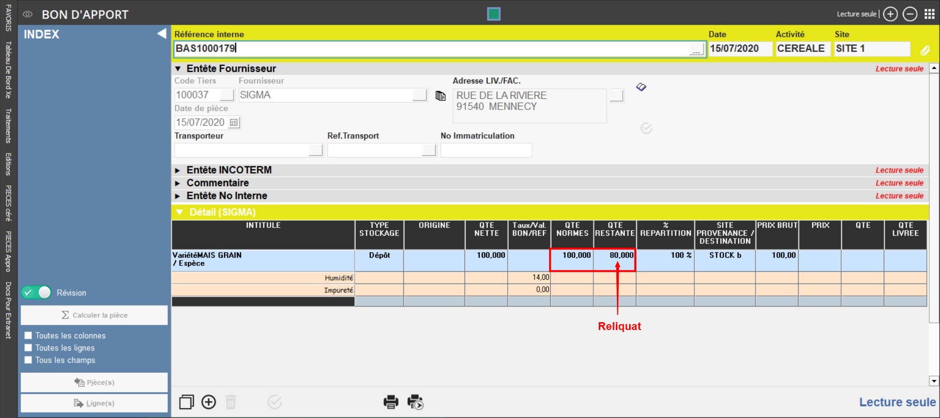 Prenons l'exemple d'un bon d'apport de type stockage Dépôt de quantité=100T, pour laquelle une partie a été reprise ou rachetée (quantité=20T).
