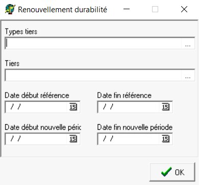 Le traitement de renouvellement de la durabilité va permettre de dupliquer les informations des critères de durabilité d'une fiche tiers, d'une période sur une autre période.