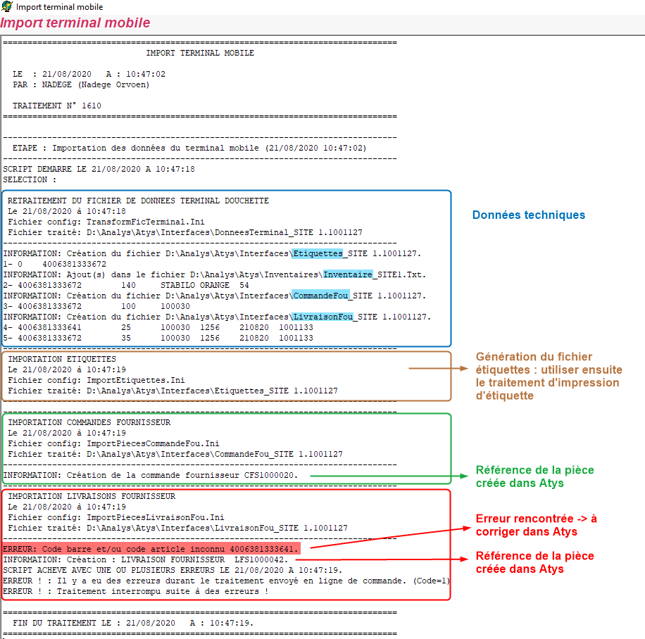 Les données déchargées sur le PC doivent ensuite être importées dans Atys, par traitement :