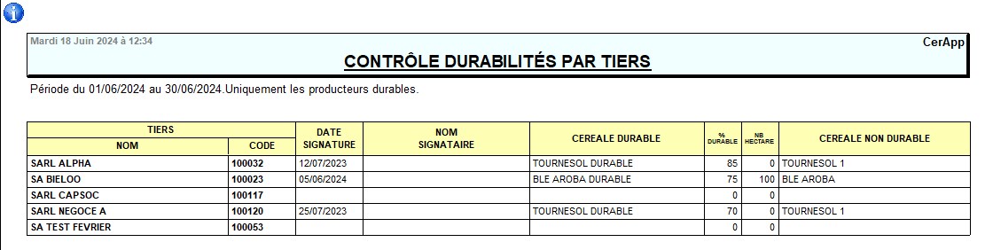 Contrôle de la validité de la déclaration des tiers durables pour la campagne.