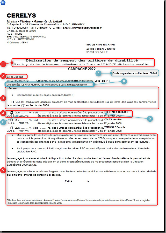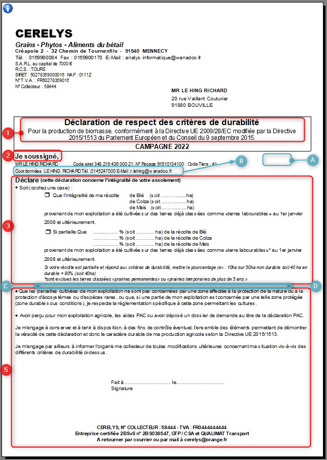 Edition de la déclaration de respect des critères de durabilité pour la production de biomasse, pour les Tiers sélectionnés.