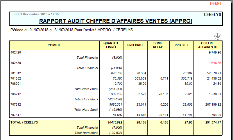 Rapport de contrôle des chiffres d'affaires, avec notion de comptes & de sections analytiques.