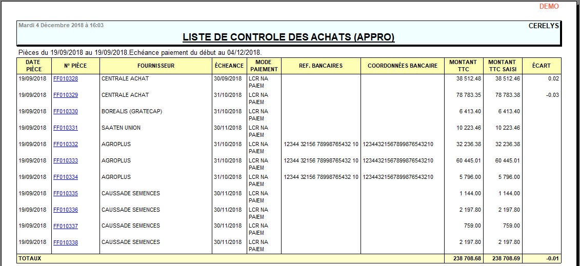 Liste des factures d'achats avec mise en évidence des écarts de montants (TTC et saisi)