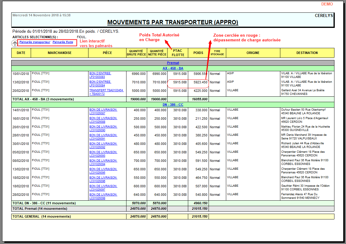 Rapport statistique des flux de marchandises par transporteur et par flotte.