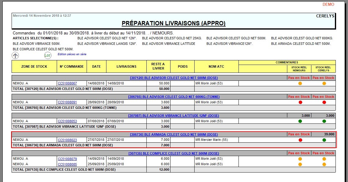 Rapport quantitatif des commandes clients à livrer avec la notion de stock réel.