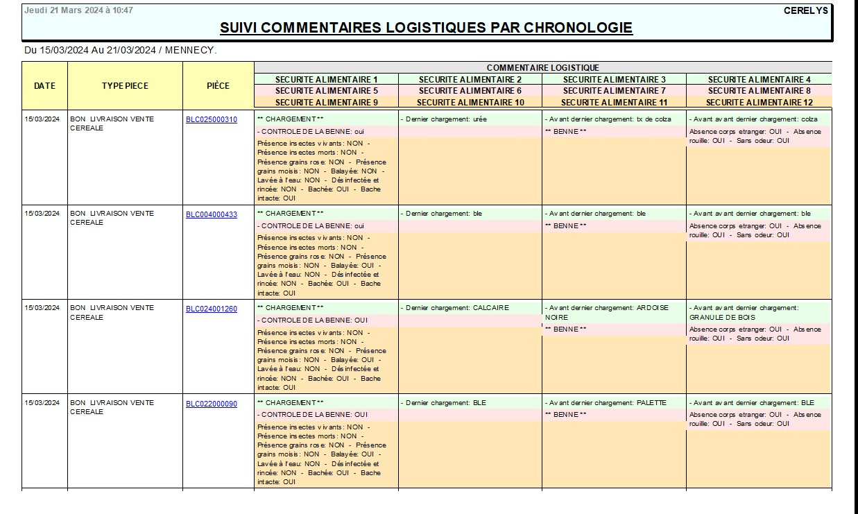 Rapport de liste des commentaires logistiques et Mémo sécurité alimentaire.