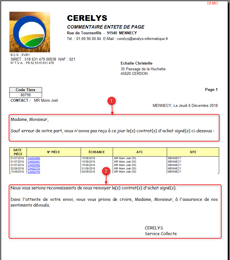 Le texte de l'entête et du pied du modèle courrier peuvent être paramétrés via le paramétrage d'édition : Paramétrage des textes Pointage des Signatures