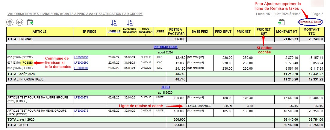 | Avec le détail des remises | A cocher pour avoir une indication des lignes de remises. Un bouton dans l'édition permet d'afficher ou masquer ce détail si besoin. |