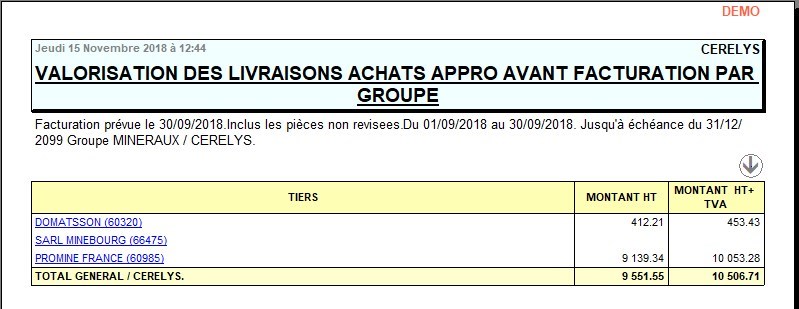 | Tri par | Article, ATC, ATC principal, Chronologie date d'échéance, Chronologie date pièce, Code article, Entité, Groupe, Périodicité, Tiers, Type tiers. |