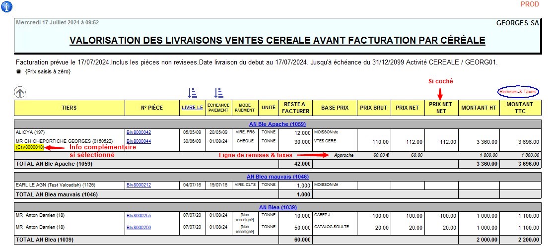 Rapport de liste des bons de livraison vente céréale à transformer en facture.