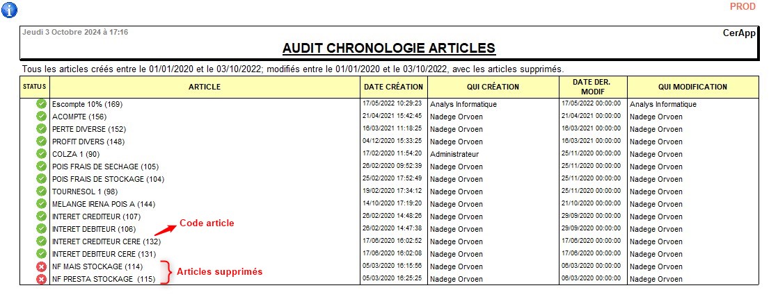 Rapport de liste des interventions sur les fiches article.