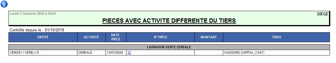 | Rapport Audit pièces avec activité différente du tiers | Recherche des pièces pour lesquelles l'activité du Tiers et de la pièce sont différentes |