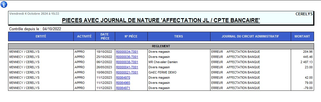 | Rapport Audit pièces avec journal de nature 'Affectation Jl / cpte bancaire' | Recherche des pièces pour lesquelles le journal de la pièce est de nature “Affectation Jl / Cpte bancaire” |