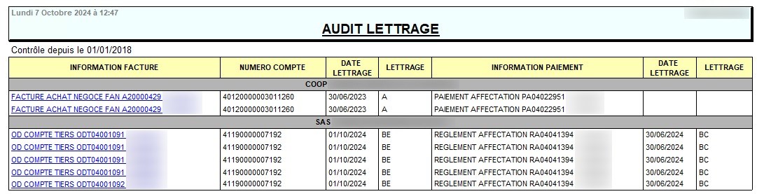 | Rapport Audit lettrage | Recherche des problèmes de lettrage sur les comptes tiers |