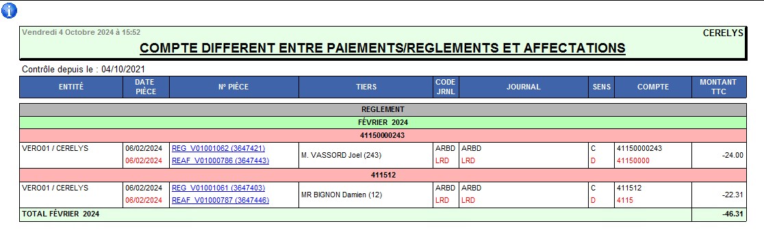 | Rapport Audit compte différent entre Paiements/Règlements et Affectations | Recherche des pièces pour lesquelles le compte tiers est paramétré différemment entre la pièce de Règlement/Paiement et son affectation |