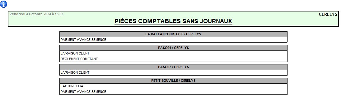 | Rapport Audit pièces comptables sans journaux | Recherche des pièces pour lesquelles aucun journal n'est affecté dans le circuit administratif ⇒ Ce ne sont pas forcément des erreurs, juste une information. |