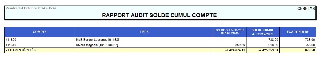 | Rapport Audit solde cumul des comptes | Vérification que la table de cumul des comptes auxiliaire est juste |