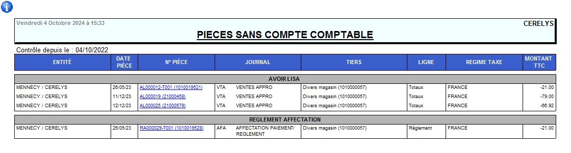 | Rapport Audit pièces sans compte comptable | Recherche des pièces sans compte comptable dans le pied (facture, paiement, règlement…) |