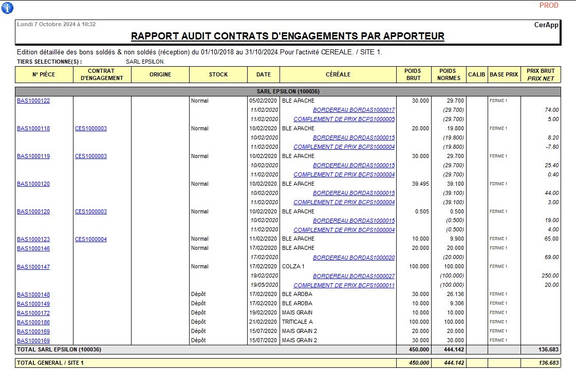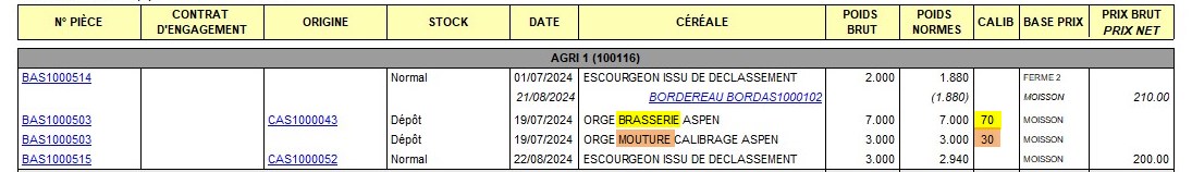 Rapport de liste des pièces de mouvements d'entrées de céréale.