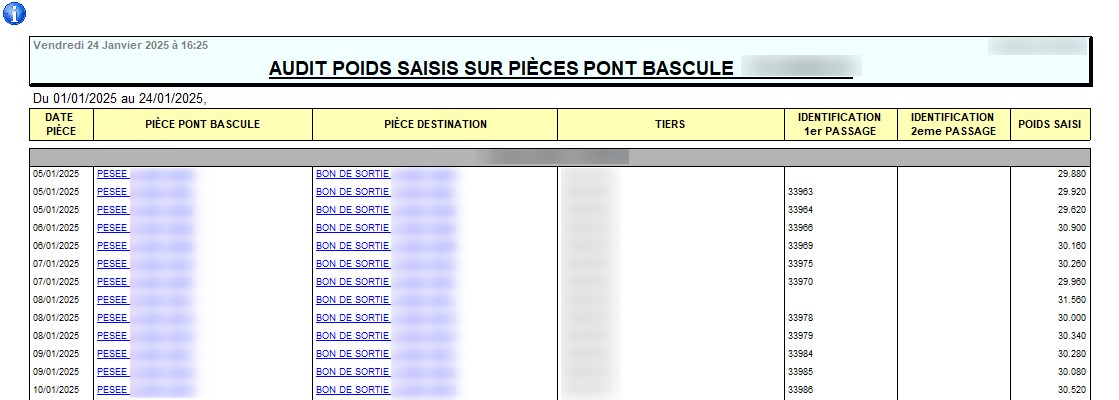 Index -> Rapports Audit -> Audit Poids saisi pièces pont