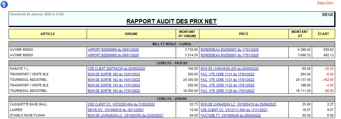 Liste des écarts de prix sur les lignes article entre une pièce et son origine.